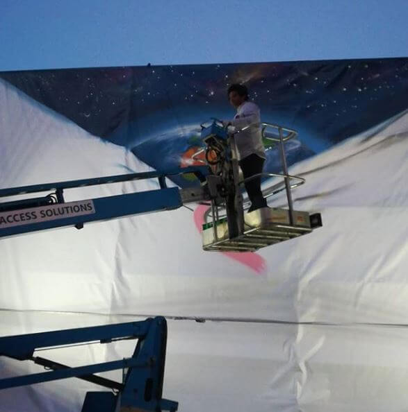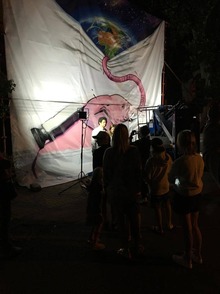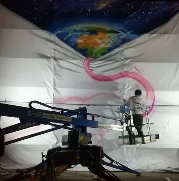 We hoisted the 12m canvas onto a scaffolding, to be rolled back and painted from top to bottom while the First Thursday crowd enjoyed the festivities, snapped photos and sipped their sangria and craft beer.